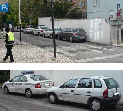 A foto, relativamente recente (a de baixo é um pormenor da de cima), mostra um local de paragem proibida, onde estacionam, calmamente, um carro da Polícia Municipal de Lisboa e um outro da autarquia. Mesmo ao lado, pode ver-se a entrada para um parque de estacionamento subterrâneo (com três pisos e 636 lugares, sempre às moscas...), e uma agente da autoridade a andar por ali.